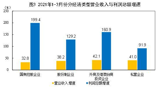 1—3月份,规模以上工业企业中,国有控股企业实现利润总额6165.4亿元,同比增长1.99倍;股份制企业实现利润总额12792.7亿元,增长1.29倍;外商及港澳台商投资企业实现利润总额5128.1亿元,增长1.61倍;私营企业实现利润总额5163.3亿元,增长91.9%。