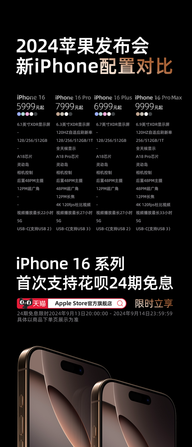 简介今日,苹果最新iPhone16系列发布。该系列四款机型将于9月13日20时起,在苹果天猫期舰店首发预售,预售前28小时,支持花呗24期分期免息购买。这是苹果首次在发新期间支持花呗24期分期免息。...