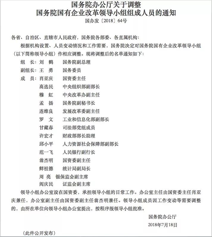 中国政府网7月26日发布《国务院办公厅关于调整国务院国有企业改革领导小组组成人员的通知》。国务院副总理刘鹤任国务院国有企业改革领导小组组长,国务委员王勇任副组长,国资委主任肖亚庆等14人为小组成员。