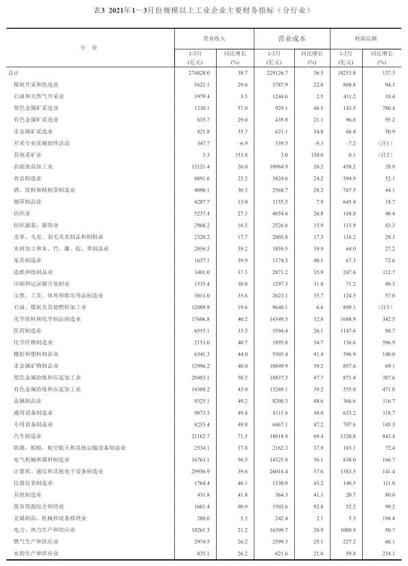 1—3月份,在41个工业大类行业中,39个行业利润总额同比增加,1个行业扭亏为盈,1个行业实现减亏。主要行业利润情况如下:汽车制造业利润总额同比增长8.43倍,有色金属冶炼和压延加工业增长4.71倍,黑色金属冶炼和压延加工业增长3.88倍,化学原料和化学制品制造业增长3.43倍,电气机械和器材制造业增长1.67倍,专用设备制造业增长1.46倍,计算机、通信和其他电子设备制造业增长1.41倍,通用设备制造业增长1.19倍,煤炭开采和洗选业增长94.3%,非金属矿物制品业增长69.1%,电力、热力生产和供应业增长50.7%,纺织业增长40.4%,农副食品加工业增长28.9%,石油和天然气开采业增长18.4%。