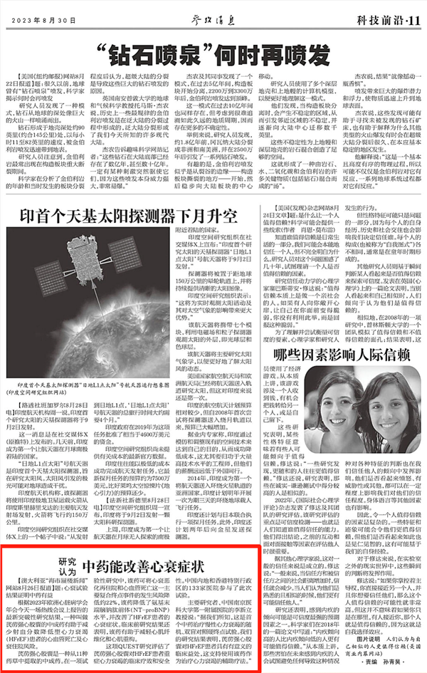 8月30日,《参考消息》刊发文章《研究认为中药能改善心衰症状》。