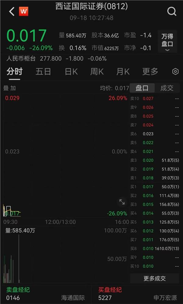 18日西证国际证券开盘大跌,截至周一10:30,已经下跌逾26%,股价跌至0.017港元,市值不到7000万港元。