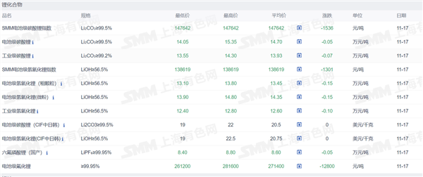 简介证券之星新能源车行业周报:据上海有色网,截止11月17日,电池级碳酸锂14.05-15.35万元/吨,均价14.7万元/吨,环比上一工作日下滑0.05万元/吨;工业级碳酸锂13.55-14.3万元/吨,均价13.93万元/吨,环比上一工作日下滑0.07万元/吨。...