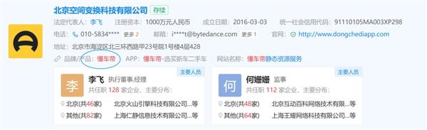 企查查显示,懂车帝的主体公司为北京空间变换科技有限公司,该公司成立于2016年3月,法定代表人为李飞,注册资本为1000万元。股权机构方面,今日头条有限公司持有前者100%股权,上层股东为抖音有限公司。
