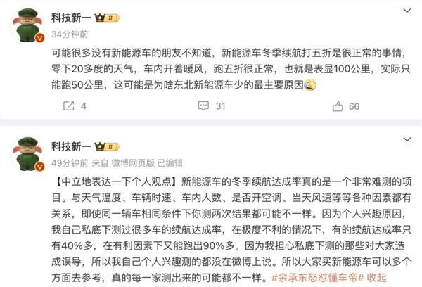当事人以外的第三方纷纷发表观点。科技数码博主@科技新一表示:新能源车的冬季续航达成率真的是一个非常难测的项目。与天气温度、车辆时速、车内人数、是否开空调、当天风速等等各种因素都有关系,即使同一辆车相同条件下你测两次结果都可能不一样。
