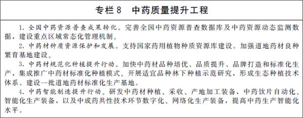3.提升中药产业发展水平。健全中药材种植养殖、仓储、物流、初加工规范标准体系。鼓励中药材产业化、商品化和适度规模化发展,推进中药材规范化种植、养殖。鼓励创建以中药材为主的优势特色产业集群和以中药材为主导的农业产业强镇。制定实施全国中药饮片炮制规范,继续推进中药炮制技术传承基地建设,探索将具有独特炮制方法的中药饮片纳入中药品种保护范围。加强中药材第三方质量检测平台建设。研究推进中药材、中药饮片信息化追溯体系建设,强化多部门协同监管。加快中药制造业数字化、网络化、智能化建设,加强技术集成和工艺创新,提升中药装备制造水平,加速中药生产工艺、流程的标准化和现代化。