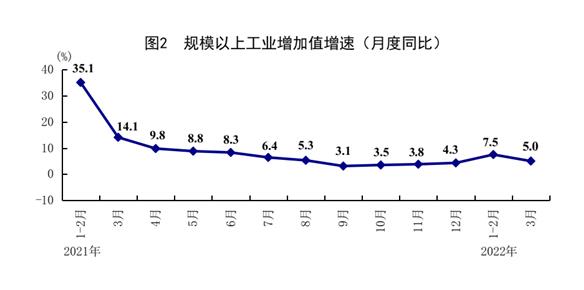 一季度,全国规模以上工业增加值同比增长6.5%。分三大门类看,采矿业增加值同比增长10.7%,制造业增长6.2%,电力、热力、燃气及水生产和供应业增长6.1%。高技术制造业、装备制造业增加值分别增长14.2%、8.1%,增速分别比规模以上工业快7.7、1.6个百分点。分经济类型看,国有控股企业增加值同比增长5.0%;股份制企业增长7.8%,外商及港澳台商投资企业增长2.1%;私营企业增长7.6%。分产品看,新能源汽车、太阳能电池、工业机器人产量分别增长140.8%、24.3%、10.2%。3月份,规模以上工业增加值同比增长5.0%,环比增长0.39%。3月份,制造业采购经理指数为49.5%,企业生产经营活动预期指数为55.7%。1-2月份,全国规模以上工业企业实现利润总额11576亿元,同比增长5.0%。