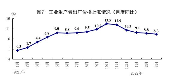 一季度,全国工业生产者出厂价格同比上涨8.7%。其中,3月份同比上涨8.3%,涨幅比上月回落0.5个百分点;环比上涨1.1%。一季度,工业生产者购进价格上涨11.3%。其中,3月份同比上涨10.7%,涨幅比上月回落0.5个百分点;环比上涨1.3%。